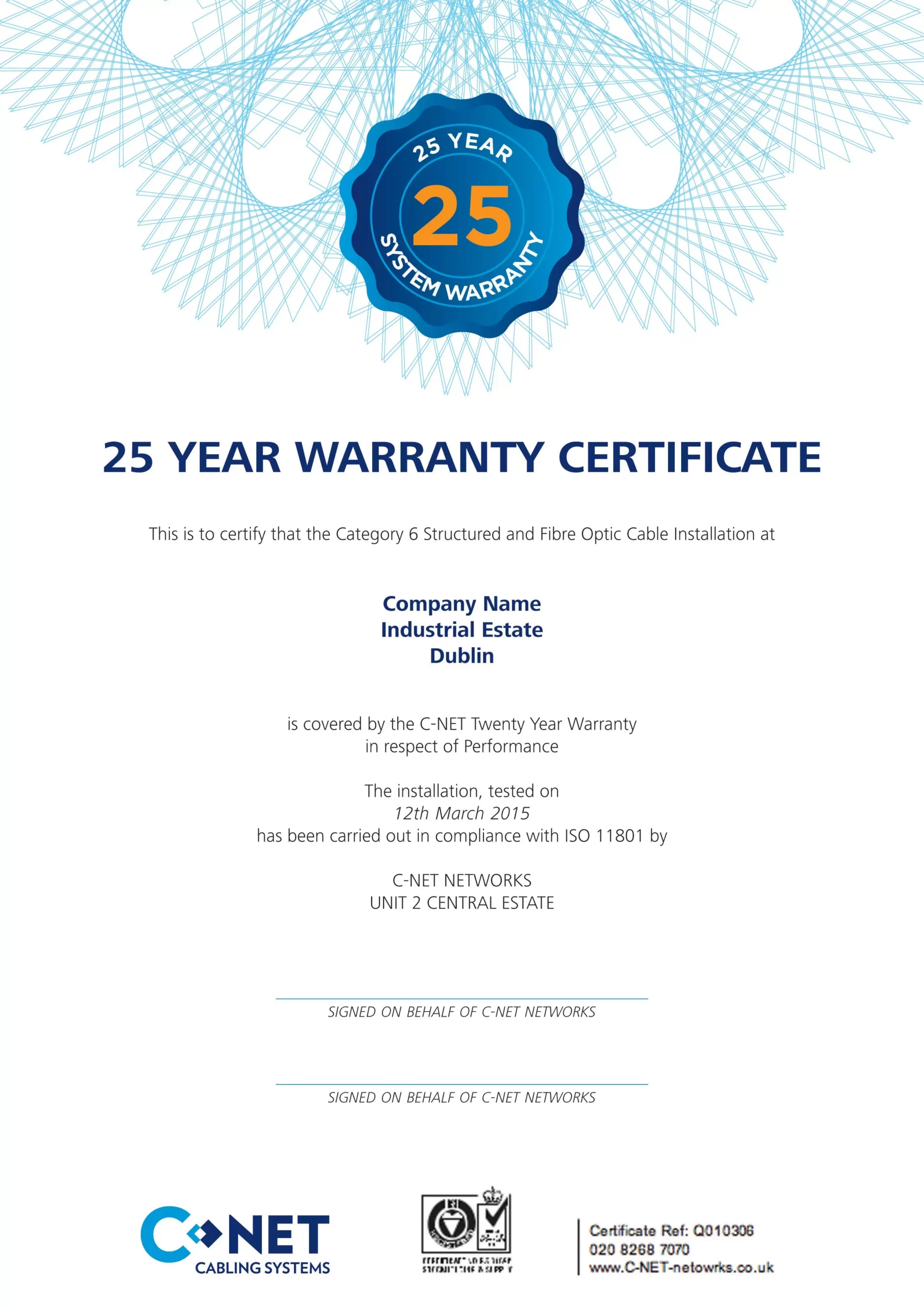 CNET structured cabling solutions are carefully selected to provide excellent quality throughout the range. 25 Year Warranty.